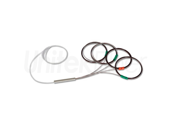 Single-mode 1:4 PLC splitter with SC/UPC connectors, low insertion loss, mini module type for GPON and FTTH distribution.
