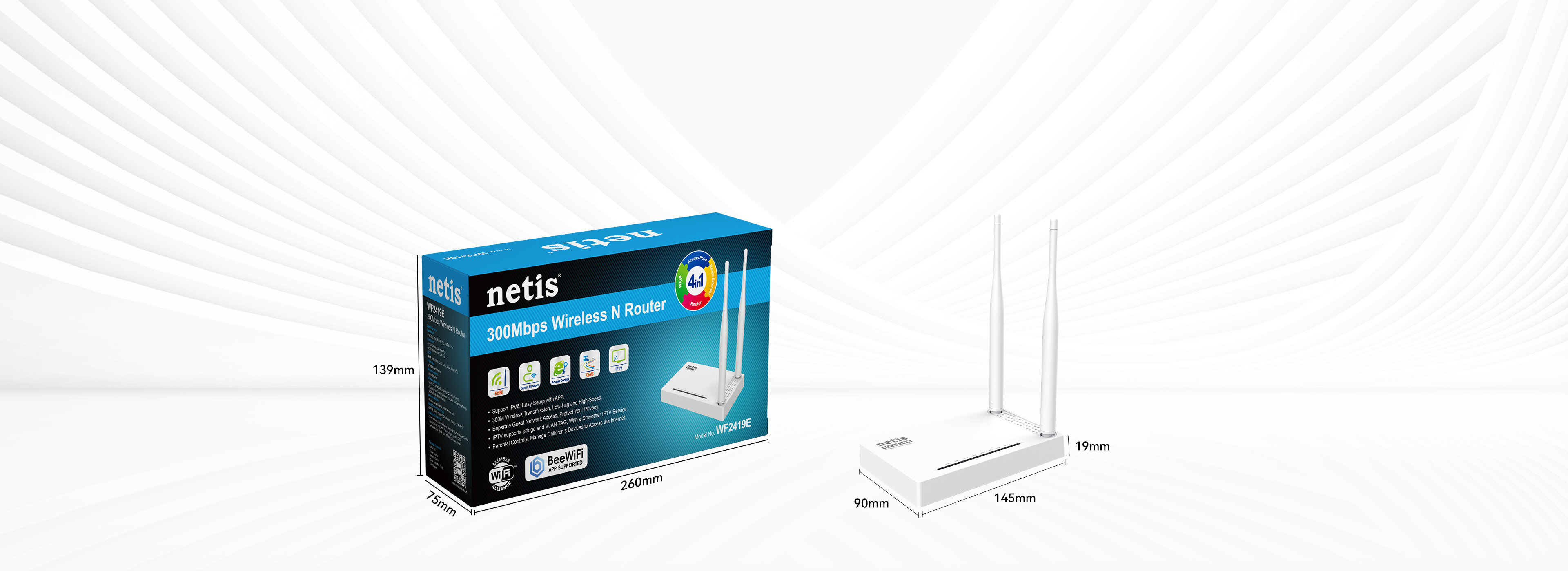 Budget-friendly N300 wireless router with 2 high-gain 5 dBi antennas, 4 LAN ports, multi-mode operation, and BeeWiFi app management.